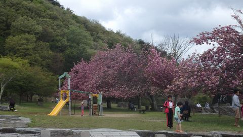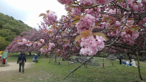 | ▼翠波高原のワシントン桜は見頃です。 | ▼サクラの下で花見のグループも見られます♪ | |