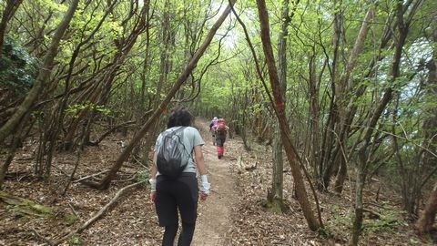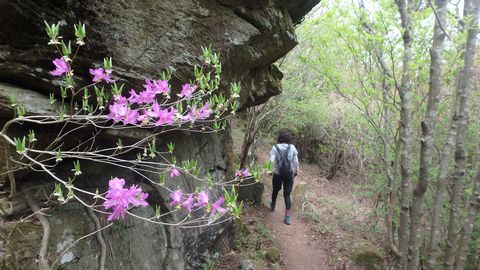 | ▼ツツジ咲く登山道を歩きます。 | ▼鋸山の展望岩です。 | |