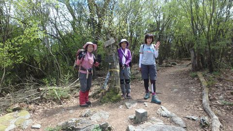 | ▼新緑とツツジの登山道を登ります。 | ▼登山口から20分強で鋸山の三角点ですが展望はありません。 | |