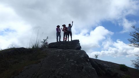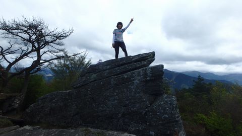 | ▼展望岩より望む豊受山(1247m)はアケボノツツジも見られるようです。 | ▼展望岩にて | |