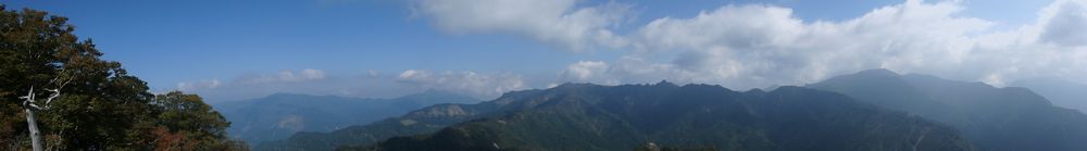 | ▼上記展望所からのパノラマ写真(右から大崩山-鹿納山-傾山・・・他) | ||