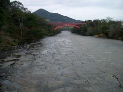 ■稲尾岳山頂に祭られる稲尾神社と雄川に架かる花瀬大橋(県道563号):雄川の珍しい川床