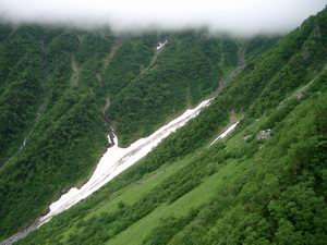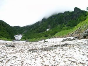 | 右俣コースから見下ろす大樺沢の雪渓 | ||