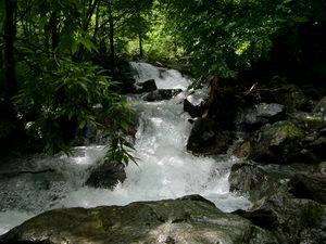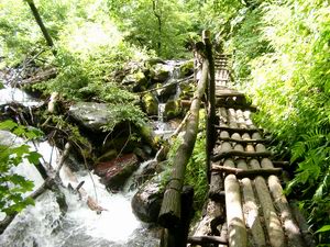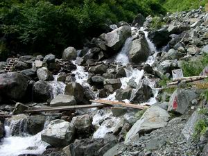 | ←大樺沢の清流 登山道も沢状態に水が流れるヶ所や山肌からの湧水ヶ所も多く水の確保は容易(二俣迄) |