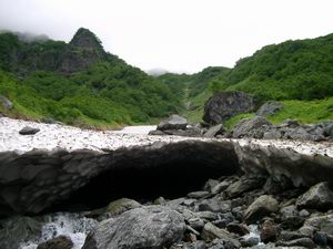 | ←右俣コース沿いの雪渓は人が立てる程の空間がある ※雪渓中央部は薄いので落ち込む危険あり! ・正面に立つと氷風が吹いて寒い(~o~) ・右方の斜面をジグザグに登り小太郎尾根に出る |