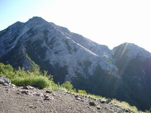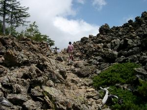| ←下山時見上げる摩利支天 ・ザレて滑りやすいルートを慎重に歩き巻き道に合流 ※注意:巻き道から摩利支天への案内板は無い (ガスが出ると危険なコースになります!) |