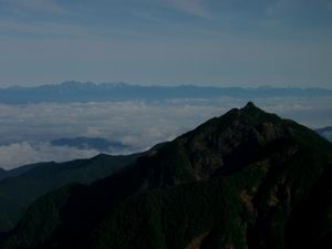 | ←駒津峰から望む北アルプス ・尖がりの槍ヶ岳もくっきり見える♪ ・手前の尖り峰は鋸岳(2685m) |