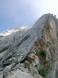 | ←六万石より直登コースを登る。 ・巨大な岩石をよじ登っていく (下山時、巻き道コースより望む直登コース) |