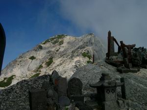| ←摩利支天から望む甲斐駒ヶ岳山頂(左方) ・祠や鉾が祭られている。 |