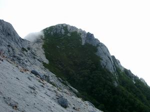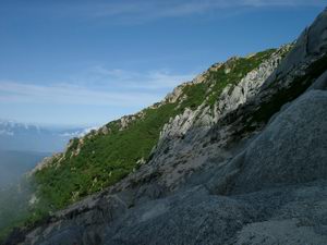 | ←仙水峠(標高2264m) ・そそり立つ摩利支天の岩峰が望めるそうですが今回はガスに隠れていた(^^;) ・左右両サイドとも上方からガレ場です落石に注意!! ・早朝暗い内は歩きにくく落石が見えないので避けた方が良さそう |