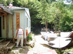 | 北沢の上流域に位置する仙水小屋に到着 ・晴天に屋根上では布団干し作業中でした。 ←巨大な凹面鏡を利用し太陽光でヤカンの水を湧かしています (大きな凹面鏡上のスタンドにヤカンが乗っている) |