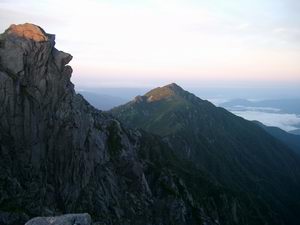 ■宝剣岳の天狗岩と三ノ沢岳(右後方)